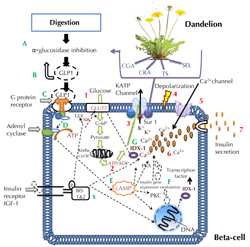 Also, plant components may stimulate and increase the biosynthesis of cyclic adenosine monophosphate (cAMP), which acts as a second messenger in β-cells by inducing cholecystokinin- and glucose-stimulated insulin release [6]. Therefore, it is possible that dandelion-derived compounds prepared from TS, CGA, CRA, and other components of medicinal plants, may be able to modulate insulin gene expression, promote insulin secretion from granules, and inhibit the degradation of β-cells [81].