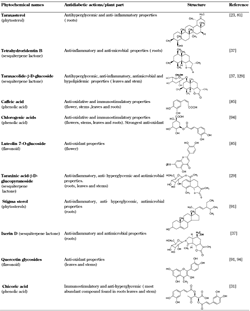 The bitterness resulting from sesquiterpene lactones is due to components such as taraxacolide, dihydro-lactucin, ixerin D, taraxinic acids, phenyl propanoids, and ainslioside, which have anti-inflammatory properties [42]. These components are often present as glycosides. The bitter taste receptor (TAS2R16) on the cells of the tongue has a protective property to prevent the ingestion of toxic substances, eliciting an aversive sensory response [43]. However, there are flaws to this evolutionary system as a large proportion of substances beneficial to health taste bitter. The health-promoting benefits of dandelion can be attributed to the presence of these bitter substances and of phenolic components, which possess anti-oxidative and anti-inflammatory activities [44]. The anti-inflammatory properties are mediated chemically by the oxygen-containing ring structure featuring a carbonyl function (α-methyl-γ-lactone). This structure reacts with nucleophiles like cysteine sulfhydryl groups [45]. Thiol groups such as cysteine protein residues are known to be the primary target group of sesquiterpene lactones [46]. Sesquiterpene lactones do not exert direct anti-oxidant activity, which is attributable to their structure, but could show greater efficacy as a direct anti-oxidant due to the presence of allylic alcohol [47, 48].