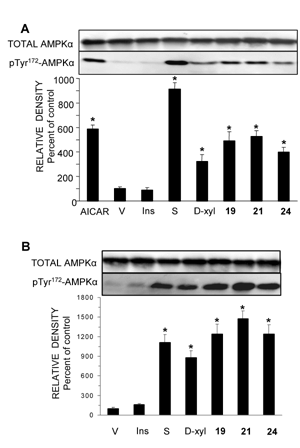 A decade ago Winder et al., introduced AMPK as a target for developing novel drugs for the treatment of type 2 diabetes [131]. Dozens of molecules that activate AMPK, directly or indirectly, were synthesized or extracted from plants. In the course of our work, we found that the pentose D-xylose augmented the rate of glucose transport in L6 and human myotubes under high glucose conditions by activating AMPK [132]. Because this effect of D-xylose was obtained at very high concentrations (10-20 mM), we synthesized more potent lipophilic derivatives of D-xylose. Among these, three highly lipophilic compounds 2,4;3,5-dibenzylidene-D-xylose-diethyl-dithioacetal (Compound 19), 2,4-benzylidene-D-xylose-diethyl-dithioacetal (Compound 21) and 2,4-benzylidene-D-xylose-3-O-methyl-diethyl-dithioacetal (Compound 24) exerted significant glucose transport stimulatory effects at low concentrations (5-100 μM) in rat and human cultured myotubes (Table 1). These effects were decreased in the presence of the AMPK inhibitor Compound C. All three derivatives and the parent compound, D-xylose, induced Thr172 phosphorylation of AMPKα and of Thr642 in the downstream substrate AS-160 (Figure 2 and Figure 3). Our study also shows that the inhibition of the insulin transduction pathway by wortmannin and an AKT inhibitor did not interfere with the glucose transport stimulatory function of these derivatives. The exact mechanism of action of these compounds is still under investigation. Of major importance is the finding that Compound 19 significantly reduced blood glucose levels towards the normoglycemic range in streptozotocin-diabetic mice and in the genetically diabetic KKAy mice. Table 1 depicts the structures of these compounds and their minimal effective concentrations in augmenting the rate of glucose transport in L6 myotubes and in lowering blood glucose levels in streptozotocin-diabetic C57/Black mice. These findings point to the potential of these compounds in the development of novel and long-acting antihyperglycemic compounds.