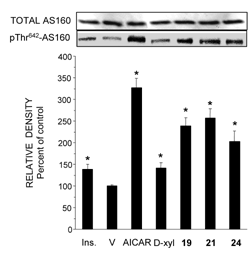 Figure 3. D-Xylose and Compounds 19, 21 and 24 activate AS160. Whole cell content of AS160 and pThr642-AS160 was determined by Western blot analysis in samples that were prepared from L6 myotubes, as described in the legend to Figure 1. Representative blot and a summary of n = 3 (*< p < 0.05) in comparison the respective controls. Reproduced with permission from [135]. |