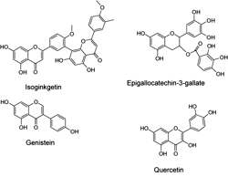 It has been assumed that phytoestrogens could reduce diabetic complications by improving glucose homeostasis and insulin resistance. For example, antilipogenic effects of the phytoestrogen genistein (Figure 5) and its capacity to decrease adiposity were related to the activation of AMPK [144]. Genistein, quercetin, isoginkgetin and epigallocathechin-3-gallate (Figure 5), contain isoflavone and isoflavone-like moieties in their structures. They activate AMPK in 3T3-L1 preadipocytes and adipocytes, adiposarcoma cells and primary mouse hepatocytes, respectively [145]. The activation of AMPK by epigallocathechin-3-gallate seems to be mediated by CaMKK [146]. Interestingly, the antioxidant properties of the gallic acid polyphenol moiety in epigallocathechin-3-gallate may also contribute to the antidiabetic effects of this compound [147]. The mechanism of AMPK activation of the other compounds is not yet clear.