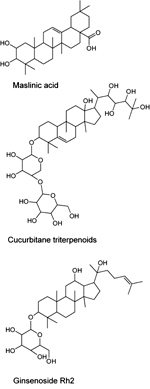 Momordicosides, such as maslinic acid, cucurbitane and ginsenosides represent another class of natural compounds that activate AMPK and may also possess antidiabetic properties (Figure 6). The main natural source of maslinic acid is olive's skin; the rest are extracted from Momordica charantia (bitter melon) [148, 149]. In addition to the four ring triterpenoidic structure, the majority of momordicosides contain one or more sugar moieties bound to the ring structure via glycoside bonds. The most abundant sugar moieties are β-D-glucopyranoside, β-D-allopyranoside and β-D-xylopyranoside. Several studies indicate that these compounds increased the rate of glucose transport and induce GLUT-4 translocation to the plasma membrane in L6 or C2C12 myotubes and in 3T3-L1 adipocytes by activating AMPK. When tested in vivo, some momordicosides enhanced fatty acid oxidation and glucose disposal during glucose tolerance tests in insulin-sensitive or insulin-resistant mice or augmented glucose-stimulated insulin secretion in mice [149, 150]. In vitro studies suggest that ginsenosides increase AMPK phosphorylation and activity in 3T3-L1 cells; however, the relevant molecular interactions have not yet been ascertained [151].