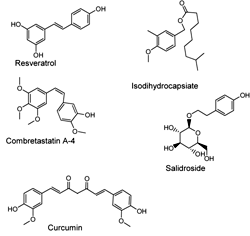 Another large group of AMPK activators have one or two phenol, polyphenol or phenolmethyl ether moieties in their structures (Figure 7). The majority of these compounds have been extracted from plants. For example, capsaicinoids, a group of the natural compounds extracted from hot peppers, have been reported to promote fatty acid oxidation and decrease body fat accumulation in diabetic mice. The synthetic structural ester isomer isodihydrocapsiate activates LKB1 both in vitro and in vivo [152]. This substance also increases glucose uptake in L6 myotubes and when administered orally to diabetic mice it substantially reduces blood glucose. A recent report indicated that salidroside, the active ingredient purified from Rhodiola Rosea, stimulated glucose transport and enhanced insulin sensitivity in L6 myotubes and 3T3-L1 adipocytes. The inhibition of AMPK activity by compound C completely abolished these effects of salidroside in L6 myotubes. This suggests that this compound exerts its effects by activating AMPK [153]. Another member of this group is the antioxidant resveratrol, which increases insulin sensitivity and lowers lipids in blood of diabetic and obese mice, most likely by activating SIRT1 [154]. Several natural analogues of resveratrol also activate AMPK [155]. One derivative, combretastatin A-4, a natural cis-stilbene is isolated from the plant Combretum caffrum. It is the most effective and potent member of this group of compounds in downregulating the expression of gluconeogenic enzymes in the liver and reducing the fasting blood glucose level in diabetic mice. The effect of combretastatin A-4 on AMPK is indirect and seems to result from the inhibition of the mitochondrial respiratory chain and a subsequent reduction in ATP levels [156].