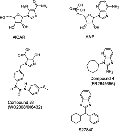 The thienopyridone derivative A769662 possesses antidiabetic effects by direct activation of AMPK [161] (Figure 8). It has been proposed that this compound activates AMPK in an AMP-independent manner, by binding to an alternative allosteric site in the AMPK complex [162]. Others have shown that A769662 binds to the carbohydrate-binding moiety in the γ subunit of the complex and to several amino acid moieties of the β1 subunit, none of which participates in AMP-binding [14]. Noteworthy is the finding that A769662 activates AMPK complexes that exclusively contain the β1 subunit. This property limits the potential therapeutic use of this compound to tissues expressing the ubiquitous β1 subunit, but not to tissue like skeletal muscle that assemble AMPKβ2 complexes. Therefore, the main target of A769662 is most likely the liver in which an activation of β1-containing AMPK complex reduces the expression of gluconeogenic enzymes and hepatic liver production [161]. Another patented thienopyridone derivative recently reported by Zhou et al. is Compound 202 (patent EP1754483A1) [141, 163] (Figure 8). Like A769662, this molecule, which contains a thienopyridone moiety, activates AMPK most likely by interacting with the β1 subunits.