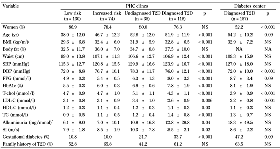 Data are mean ± SD, or percentage. P-values (ANOVA/Chi-square) are for tests of heterogeneity, i.e. any differences among groups. BMI: body mass index. SBP: systolic blood pressure. DBP: diastolic blood pressure. FPG: fasting plasma glucose. LDL-C: low-density lipoprotein cholesterol. HDL-C: high-density lipoprotein cholesterol. TG: triglycerides. SI: stiffness index. T2D type 2 diabetes. PHC: primary health care. NS: not significant. NA: not available. * Albuminuria is defined as urine albumin/creatinine. |