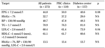 Metabolic control of diabetic patients followed at primary health care clinics and diabetes center according to internationally recommended targets |