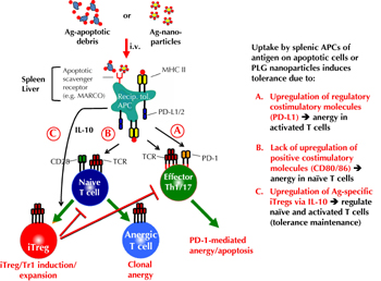Figure 1. Proposed mechanisms of tolerance induced by antigen-coupled apoptotic cells and Ag-coupled PLG nanoparticles. Intravenous infusion of Ag-coupled ECDI-fixed apoptotic cells or Ag-coupled biodegradable PLG nanoparticles enter 'tolerogenic' APCs in the spleen and liver via scavenger receptors, e.g. MARCO [27, 54]. Uptake leads to presentation of the coupled Ag by MHC molecules on the host splenic and liver APCs. Concomitantly, signals resulting from the scavenger receptor uptake cause upregulation of regulatory costimulatory molecules, e.g. PD-L1/2 without upregulation of positive costimulatory molecules, e.g. CD80 and CD86, as well as the production of IL-10 and TGF-β [27]. A. Host tolerogenic APCs induce anergy/apoptosis in activated antigen-specific T cells via engagement of PD-1 which is upregulated on activated T cells [27, 60-62]. B. Host tolerogenic APCs induce anergy in naive antigen-specific T cells by presenting cognate Ag/MHC in the absence of positive costimulatory interactions (i.e. signal one in the absence of signal 2) [21]. C. PD-L1 expressing, IL-10-producing host tolerogenic APCs induce the induction/expansion of antigen-specific induced regulatory T cells (Tregs)/Tr1 cells, which synergistically act to regulate the differentiation of naive T cells to become pathogenic effector T cells, and which regulate the effector function/trafficking of activated pathogenic T cells [27, 60, 63, 64]. |