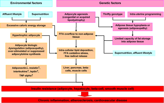 The inherited defects resulting from adipose tissue differentiation are not fully adapted to modern lifestyles and excess caloric intake. Inadequate adipose tissue mass and overnutrition cause adipocytes to increase fat cell size and stimulate release of insulin-resistant adipocytokines. These processes cause severe insulin resistance, endothelial dysfunction, a proinflammatory state and promote the progression of atherosclerosis. Overnutrition as excess FA overflow to ectopic fat storage organs, such as the liver, muscle, and pancreatic beta-cells, cause functional alternation in these cells and shift the intra-cellular metabolic pathway towards insulin resistance.