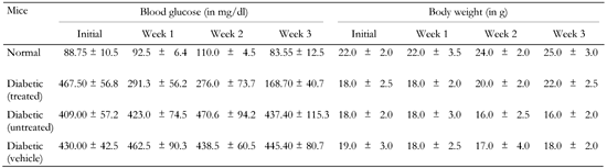 The table represents non-fasting blood glucose levels in normal, treated diabetic, untreated diabetic and vehicle-administered diabetic animals during the study period. Values are expressed in mg/dl and represent mean ± SD (n = 8-10). |