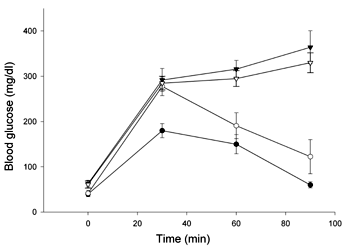 Figure 1. Oral glucose tolerance curve. Animals in all four groups (normal -●-; BQOV-treated -○-; untreated diabetic -▼-; vehicle-administered -∇-) were kept for 10 hours fasting and then glucose (2 g/kg) was administered orally. Blood glucose was monitored at 30 min intervals till 90 min. Values represent mean ± SD (n = 5). |