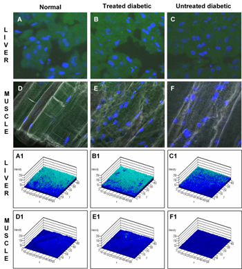 Figure 2. Glucose uptake in liver and skeletal muscle. During OGTT, animals were injected with 2-NBDG at the 30 min time point and then sacrificed after 30 min to collect liver and muscle. Cryosections (10µm) were cut and observed under a confocal microscope at 485/540 nm wavelength to observe green fluorescence of 2-NBDG and UV in order to locate the DAPI stained nucleus. The upper row of images shows liver sections of normal, treated diabetic and untreated diabetic groups respectively (A-C). The second row of images shows muscle sections of normal, treated diabetic and untreated diabetic groups respectively (D-F). The lower panel shows 2.5D analysis images of the sections respectively, where the x and y axis are the pixels and the z axis represents intensity depicting the semi-quantitative uptake of 2-NBDG (A1-F1). |