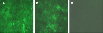 Figure 3. Glucose uptake in L6 myoblasts. 20-24 hours serum-starved L6 cells were stimulated with 100 nM insulin (A), 25 µM BQOV (B) or kept as untreated basal control (C) and then glucose uptake assay was performed as described in the Materials and Methods section. Cells were then observed under fluorescence microscope at 485/540 nm wavelength to observe green fluorescence of 2-NBDG. |