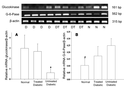 Figure 4. mRNA levels of G-6-Pase and glucokinase. The graphs represent the relative mRNA of G-6-Pase (A) and glucokinase (B) with respect to β-actin in the three animal groups. Values represent mean ± SD (n = 3-5). *p < 0.05 vs. normal as well as treated diabetic animals, #p < 0.05 vs. untreated diabetic. |