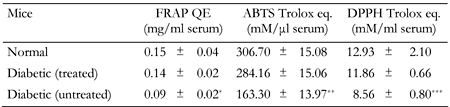 The table represents radical scavenging (ABTS and DPPH) and reducing power (FRAP) of serum of animals in the three groups at the end of the study period. Values represent mean ± SD (n = 3-5). FRAP: ferric reducing antioxidant power. QE: quercetin equivalents. ABTS: 2.2'-azinobis(3-ethylbenzothiazoline-6-sulfonic acid. DPPH: 2,2-diphenyl-picrylhydrazyl. *p < 0.05 vs. normal, **p < 0.001 vs. normal as well as treated diabetic, ***p < 0.05 vs. normal as well as treated diabetic. |