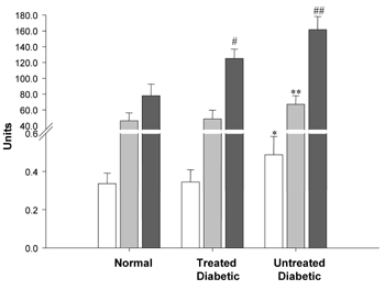 Figure 5. Serum analysis. Animal serum was analyzed for kidney and liver function. Creatinine (white column) and urea (light gray column) was measured in mg/ml, alkaline phosphatase (dark gray column) levels were measured in U/l. Values represent mean ± SD (n = 4-5). *p = 0.044 vs. normal, **p = 0.054 vs. normal, #p = 0.016 vs normal, ##p < 0.001 vs. normal and p = 0.003 vs. treated diabetic. |