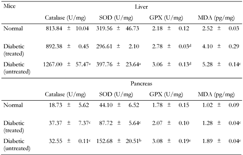 The table represents catalase, SOD and GPX enzyme activities and MDA levels in the tissues of animals in the three groups. SOD: superoxide dismutase. GPX: glutathione peroxidase. MDA: malonyldialdehydes. a p < 0.05 vs. normal and vs. treated diabetic, b p < 0.05 vs. treated diabetic, c p < 0.05 vs. normal. d p < 0.001 vs. normal, e p < 0.001 vs. normal and vs. treated diabetic. |