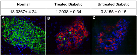 Figure 6. Insulin level in the pancreas. The table represents the amount of insulin in pancreatic extracts of animals from different groups. Pancreatic extracts were prepared in acid-ethanol and the amount of insulin was quantitated by ELISA (ng insulin/mg pancreas). Data are mean ± SD. The pictures represent confocal images of pancreatic sections of normal (A), treated diabetic (B) and untreated diabetic (C) groups, where insulin is green, glucagon is red and the nucleus is stained blue by DAPI. |