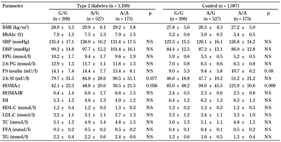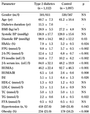Data are mean ± SD. Data compared using chi-squared test (gender, hypertension, obesity), or unpaired Student's t-test (other). BMI: body mass index. BP: blood pressure. HbA1c: glycated hemoglobin. FPG: fasting plasma glucose. PG: plasma glucose. FS: fasting serum. HOMA-β: homeostasis model assessment of β-cells. HOMA-IR: homeostasis model assessment of insulin resistance. ISI: insulin sensitivity index. HDL-C: high-density lipoprotein cholesterol. LDL-C: low-density lipoprotein cholesterol. TC: total cholesterol. TG: triglycerides. FFA: free fatty acids. NS: not significant. |