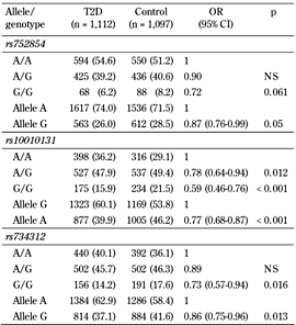 Total DNA was isolated from whole-blood samples pretreated with proteinase K using a standard protocol for extraction with phenol-chloroform. Genotyping of rs734312, rs10010131, and rs752854 in WFS1 was performed by a Taqman-based allelic discrimination on a Real-Time PCR System 7500 (Applied Biosystems, Foster City, CA, USA) using the recommended protocol [17]. Overall, genotype calling rate was 99.0% for rs10010131, 98.8% for rs734312, and 98.1% for rs752854.