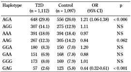 Data were analyzed with SPSS/Win programs (version 13.0; SPSS Inc., Chicago, IL, USA). Results are given as mean ± SD, or percentages. Skewed variables for the continuous traits were log-transformed before statistical comparisons were made. For comparison of quantitative data in groups of affected and non-affected patients, unpaired Student's t-test was used. Tests for Hardy-Weinberg equilibrium and comparison of genotype and allele frequencies in the T2D subjects and controls were performed using the chi-squared test with Yates' correction. OR and 95% CI were used to assess the extent of association of the various genotypes with T2D. A wild-type genotype was used as a reference group to provide separate OR for each genotype.