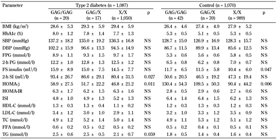 Data are mean ± SD. P-values adjusted for gender, age, BMI, obesity, HbA1c, and hypertension. Haplotype GAG includes allele G of rs752854, allele A of rs10010131, and allele G of rs734312. X designates any haplotype other than the haplotype GAG. BMI: body mass index. HbA1c: glycated hemoglobin. SBP: systolic blood pressure. DBP: diastolic blood pressure. FPG: fasting plasma glucose. PG: plasma glucose. FS: fasting serum. HOMA-β: homeostasis model assessment of β-cells. HOMA-IR: homeostasis model assessment of insulin resistance. ISI: insulin sensitivity index. HDL-C: high-density lipoprotein cholesterol. LDL-C: low-density lipoprotein cholesterol. TC: total cholesterol. TG: triglycerides. FFA: free fatty acids. NS: not significant. |