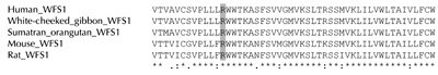 Figure 1. Alignment of the protein sequence of human wolframin (aa 599-648) against wolframin aa sequences of other mammals. Arginine (R) at codon 611 is highlighted in gray. |